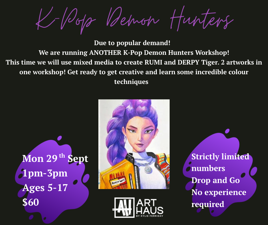 What- K-Pop demon hunters are so in right now! Rumi and Derpy Tiger are begging to be created! We will use mixed media to create these favourite characters. Learn colours, shading and sketching! There is no lunch included in this workshop so please ensure they arrive with a full belly